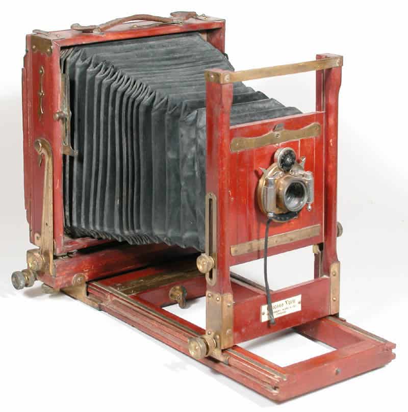 Materials: mahogany body, cherry base, brass hardware, black fabric and rubber bellows
