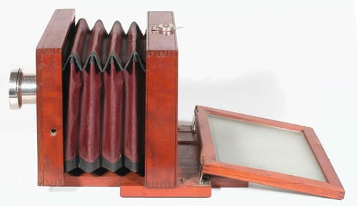 Materials: mahogany or cherry body; cherry bed; red leatherette bellows; nickeled hardware; varnish finish