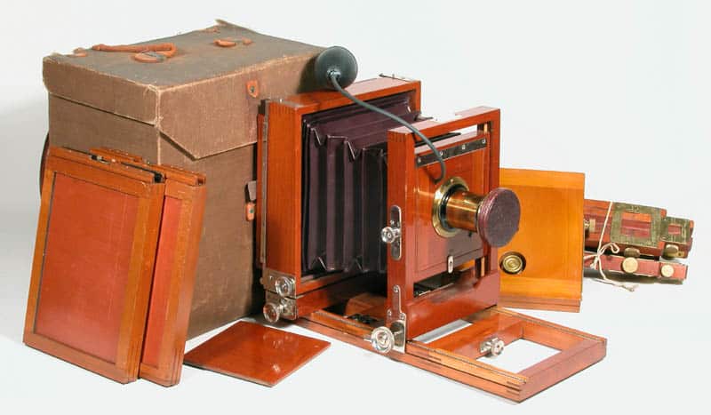 Notes: Variation 1 had draw file brass hardware, Variation 2 had nickeled hardware. Also, this variation has a redder color of finish, leather bellows rather than cloth, a single catch for the lensboard rather than two, a lensboard which has a groove along its left and right edges rather than being plain, a lower profile spring back than Variation 1, and it lacks the patent bed clamps. The photographed camera is 5×7 format.