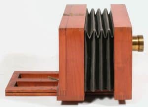 Materials: cherry body and base; black leatherette bellows; brass hardware, varnish finish