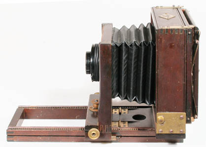 Materials: darkly stained mahogany and cherry; matte finish brass hardware; black leatherette bellows