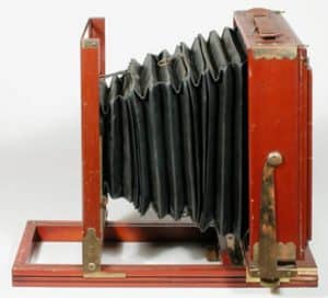 Materials: mahogany body; cherry base; black leatherette bellows; brass hardware