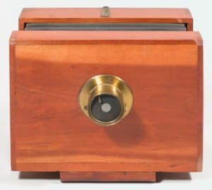 Materials: cherry body and base; black leatherette bellows; brass hardware, varnish finish