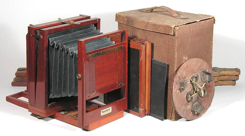 Notes: The photographs illustrate the 6.5×8.5 size. This camera is finished with a very red varnish. Compare to the Favorites of Rochester Camera Mfg. Co, Rochester Camera & Supply Co. and Rochester Optical Co. Also compare this design to Scovill’s Acme Back Focus Cone Camera.