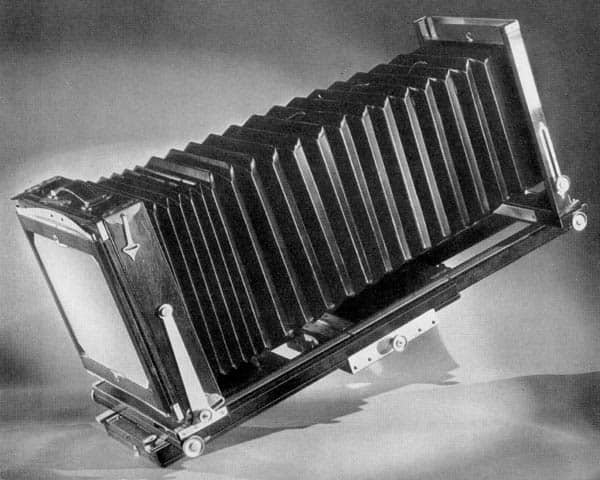 Materials: darkly stained cherry; brass hardware; black leatherette bellows